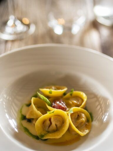 Traditional house-made tortellini-style pasta, filled with rustic tomato sauce and finished with basil oil